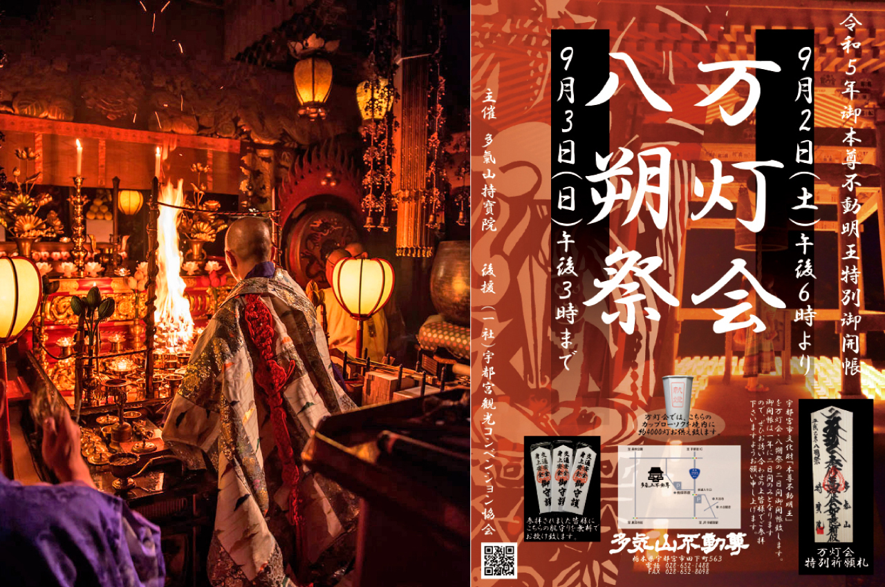 年に一度、9月の第一日曜日に行われる「八朔祭」では、宇都宮市指定有形文化財に登録されているご本尊の「不動明王」が御開帳されます。2023年は9月2日(土)「万灯会」、3日(日)「八朔祭」です。大護摩供でご加護を願う特別な2日間。ぜひご縁を結びに出かけてはいかがでしょうか。