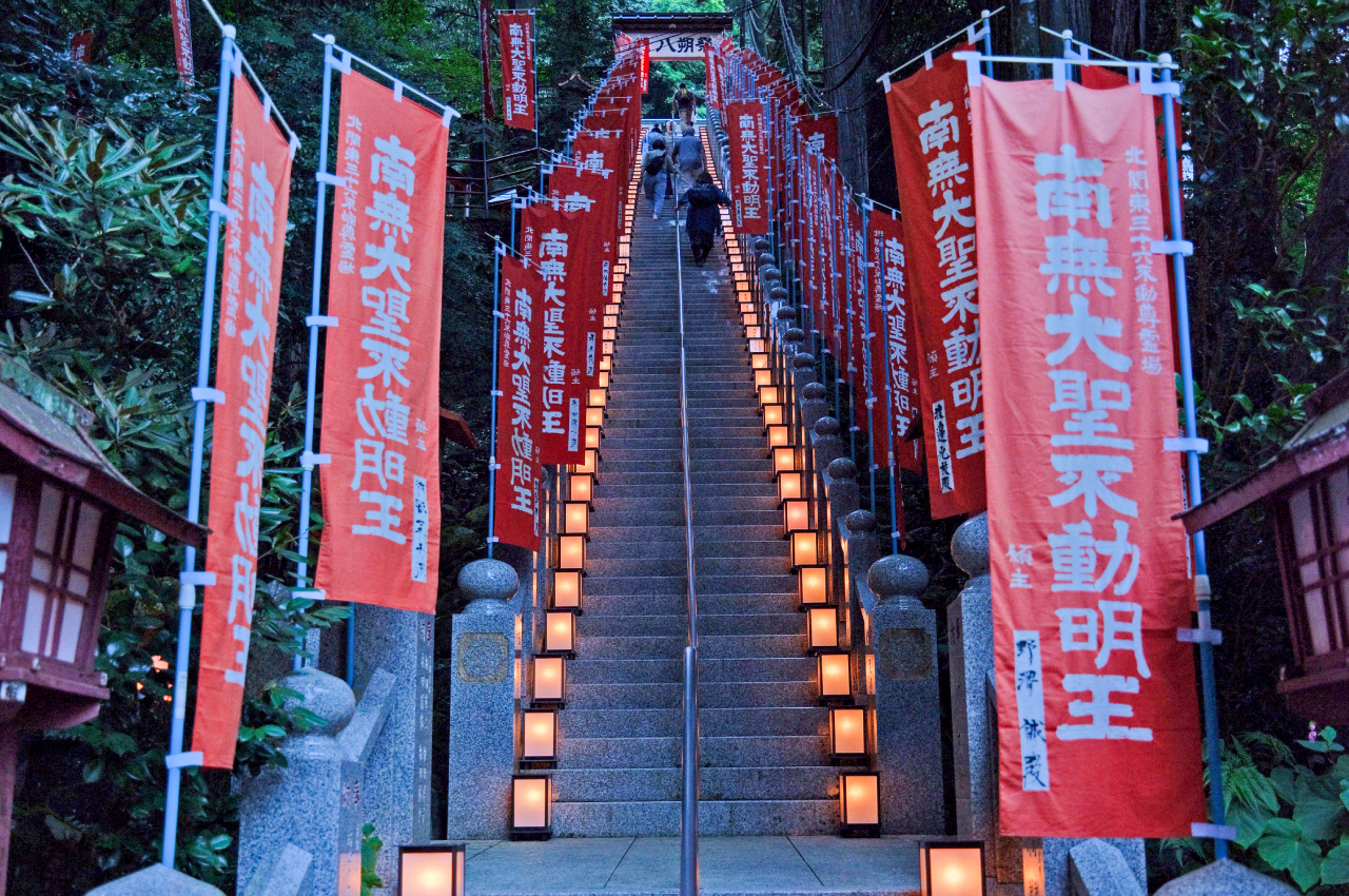 「八朔祭」の前日に行われる「万灯会」。参道から境内へと続く階段、諸堂まで約4000本のろうそくが灯り、幻想的な雰囲気に包まれます。