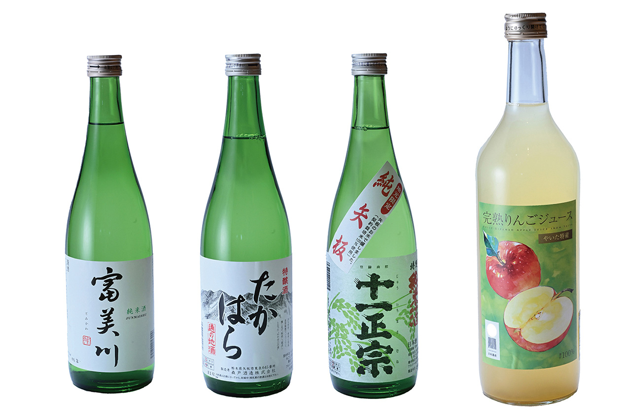 りんごをギュギュ~ッと搾った果汁100%ジュース「完熟りんごジュース」は600円。矢板市産米を原料に作られた、個性が光る地酒も購入できます。