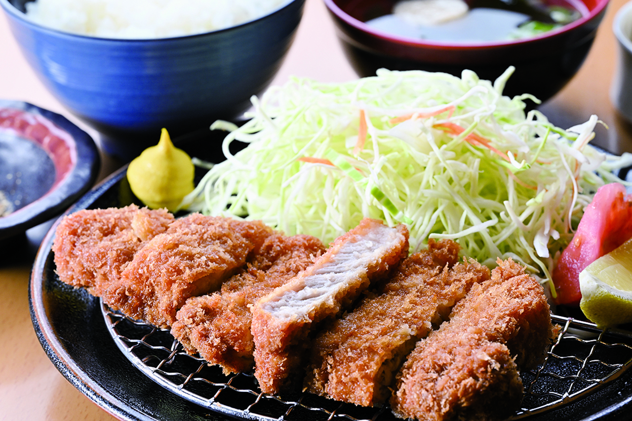 とんかつ定食(みそ汁、漬物付き) 1,350円。ほんのり甘味を感じる和豚もちぶたを使用。