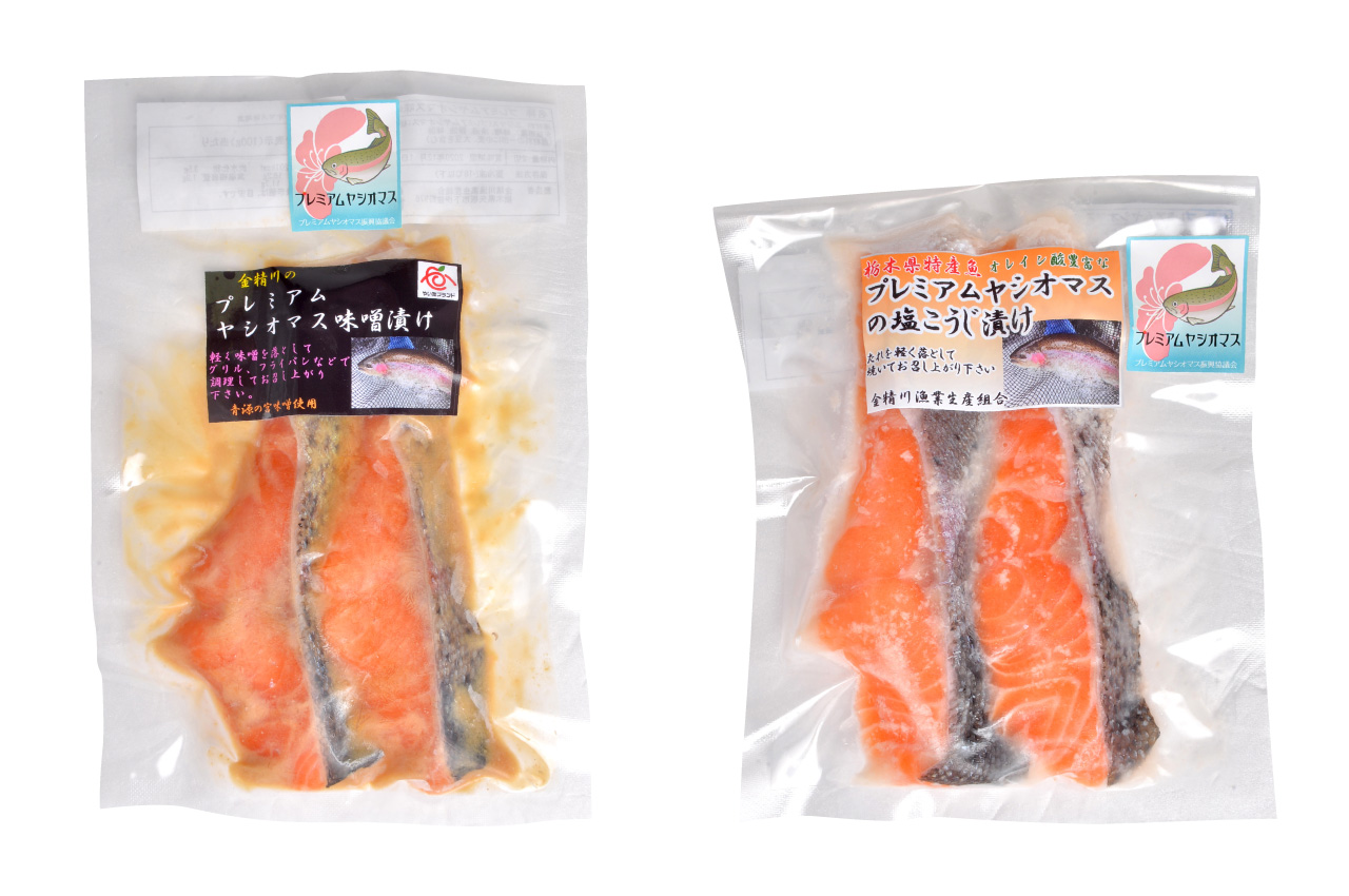 特別なエサで飼育される、栃木が育む究極のニジマス。オレイン酸を多く含み、脂は甘く肉質はやわらかです。塩こうじ漬け 2切入り540円&味噌漬け2切入り540円。