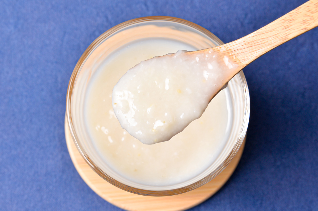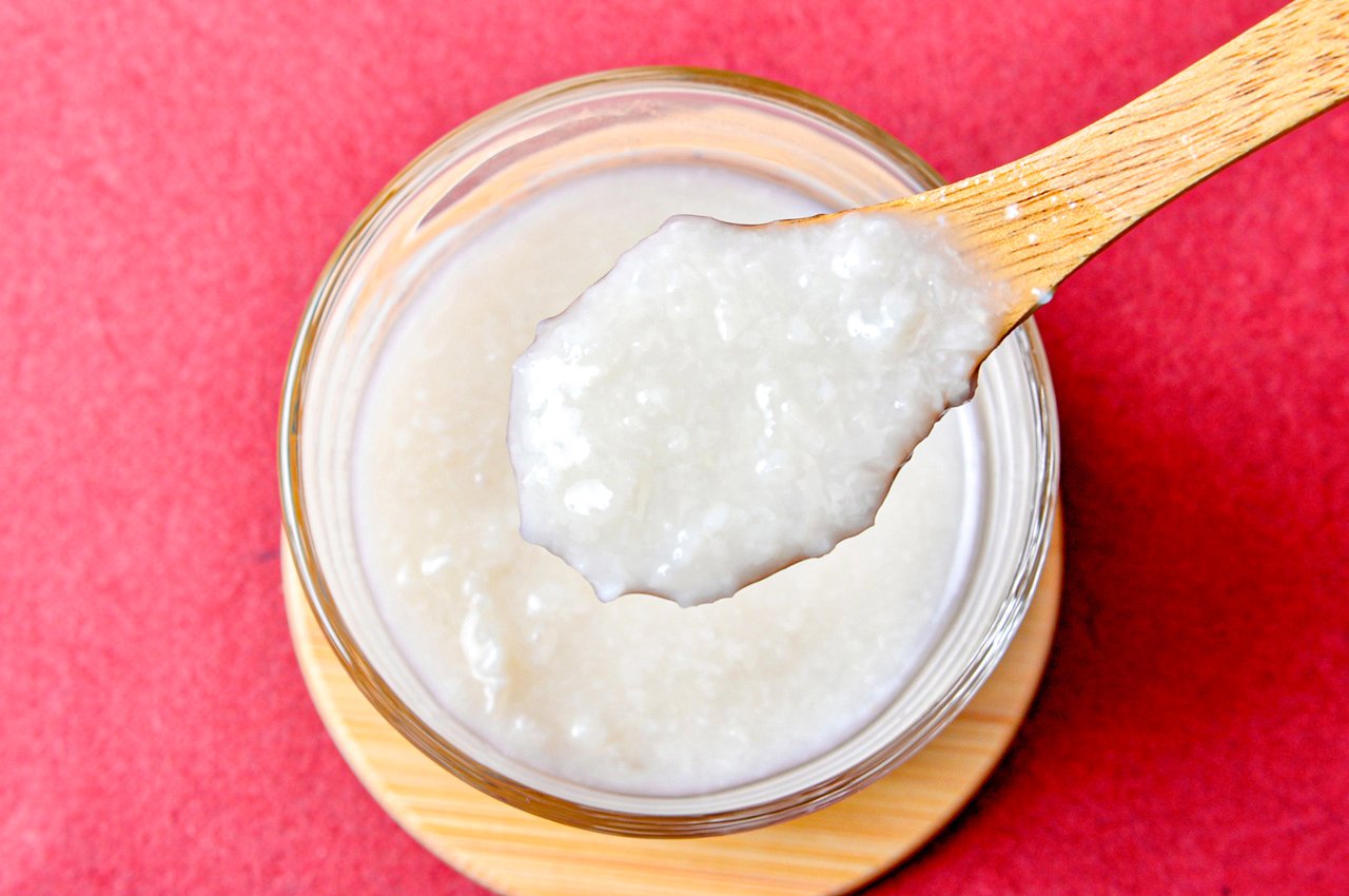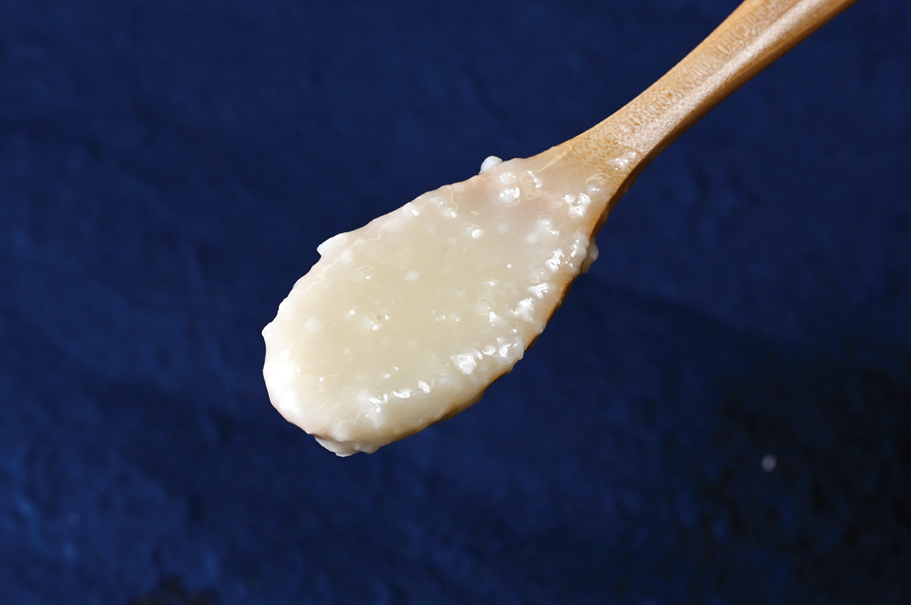 米糀とおかゆは2:1で程よいつぶつぶ感。熱処理を行わず作り立てを提供するため、電話予約してから行きましょう。