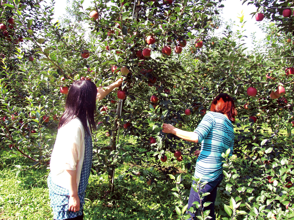 リンゴ狩りでは、あらかじめ試食してから、好みの種類をチョイス! 甘いリンゴの見分け方を教えてもらって、畑へGO♪ 木の下から狙いを定め、脚立に上って近くから確認。さて、自分で採ったリンゴのお味は?