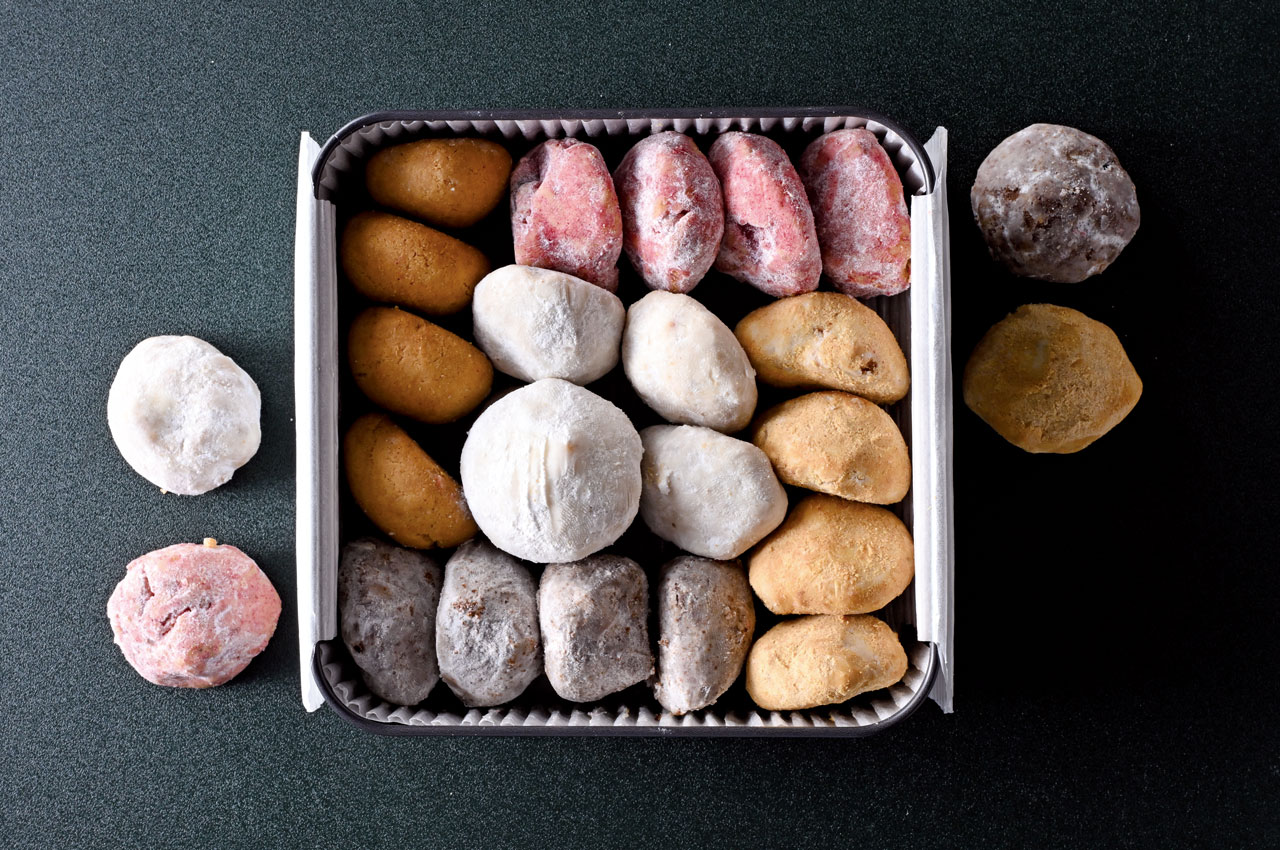 『宇都宮』の『ブールドネージュ』でミヤネージュ。FLAGSのブールドネージュはバターのやさしい香りがふわっと広がり、「あともう一つだけ」とつい手が伸びます。コロンとかわいい5種(プレーン、フランボワーズ、ココア、きなこ、チーズ)を味わい尽くして。チーズ以外にはクルミが入っています。