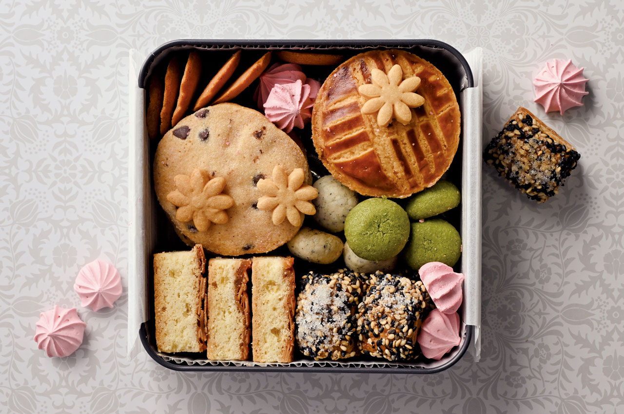 ガレット、フロランタン、チョコチップクッキー、抹茶と紅茶のブールドネージュ、苺のラングドシャ、ごまパイ、ベリーメレンゲ。可憐なお花は米粉クッキーです。個性豊かな食感と風味がぎゅっ。パティスリー ウエストのクッキー缶は、どれから食べようか迷う楽しさも醍醐味です。