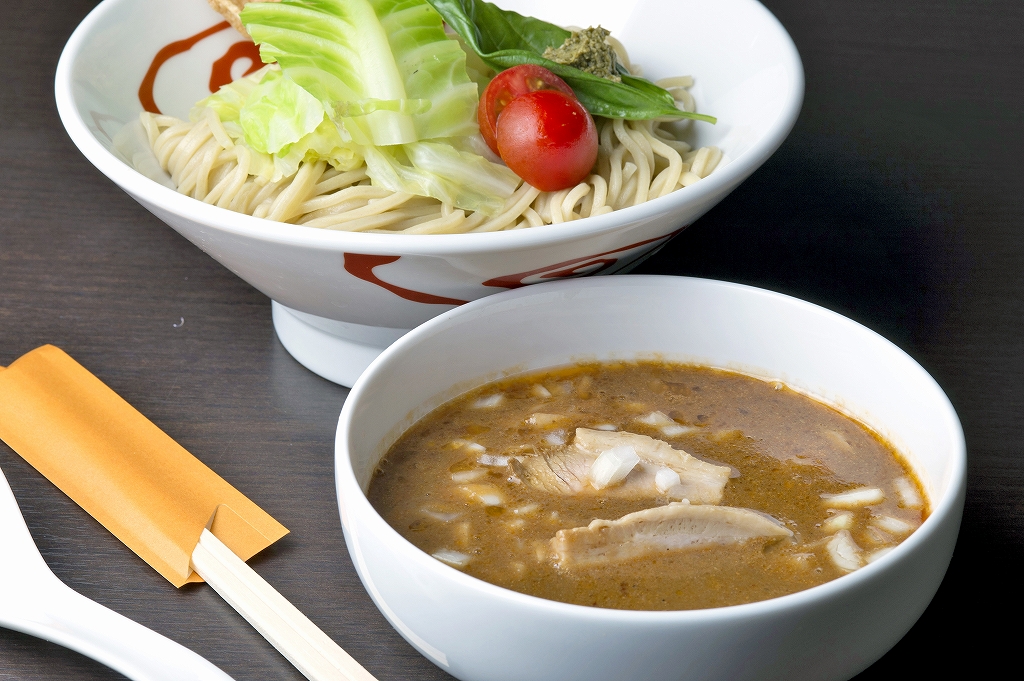 エビ好きのつけ麺派にはこちらがおすすめ。同じく海老のうま味を堪能しながら、ほんのり甘く、苦みもほどよいアクセントのバジル味噌のつけ汁が食欲をそそる「海老つけ麺 濃厚ストレート」。こちらも鶏白湯のあわせスープのオーダーが可能。麺の風味・エビのうま味・味噌&バジルのうま味のバランスがとれた一杯です。