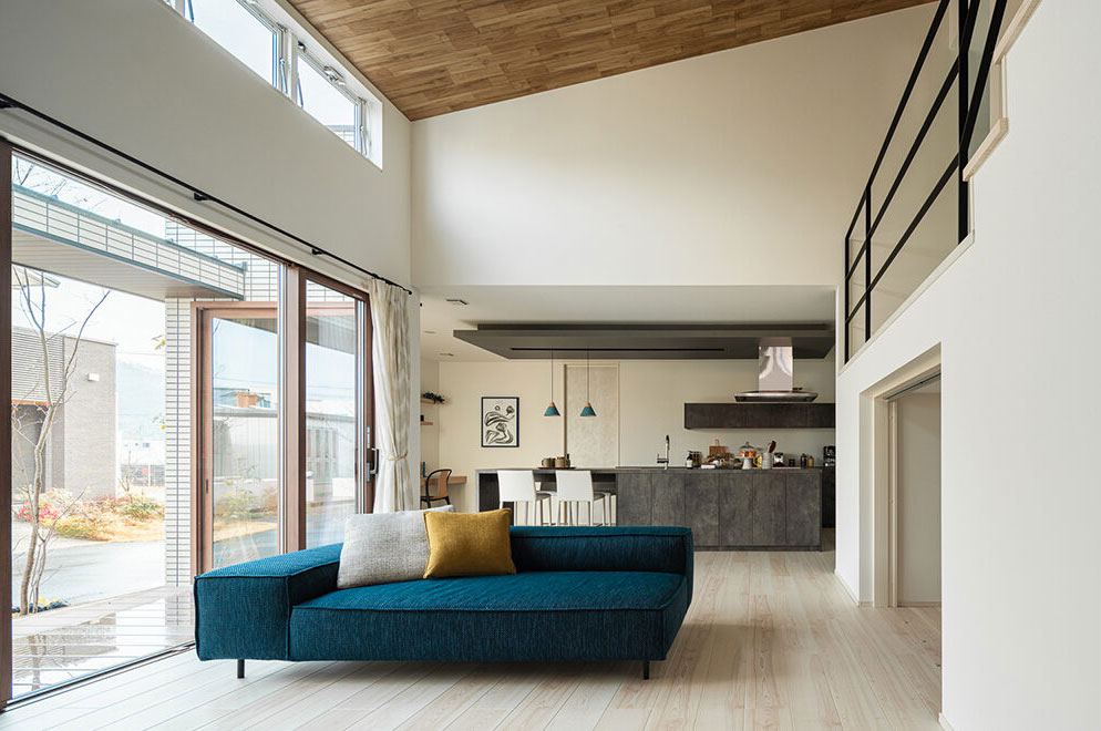 勾配天井を活かしたゆとりの空間が生まれるリビング。家族で過ごす時間も快適に。