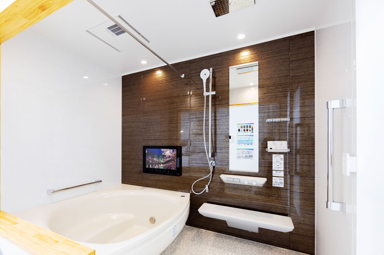 1.5坪の広々バスルームは浴室テレビ付き。平屋全体が夏は涼しく冬は暖かい、高気密・高断熱仕様も標準装備。地震に備える「耐震等級3」の設備も、もちろん標準装備。独自の制震システムで複数回の地震にも耐えられます。