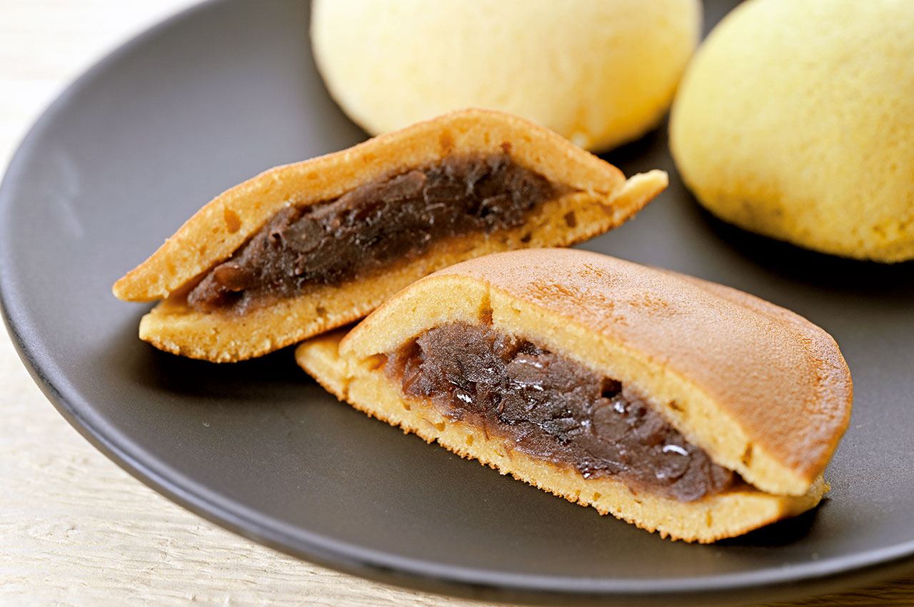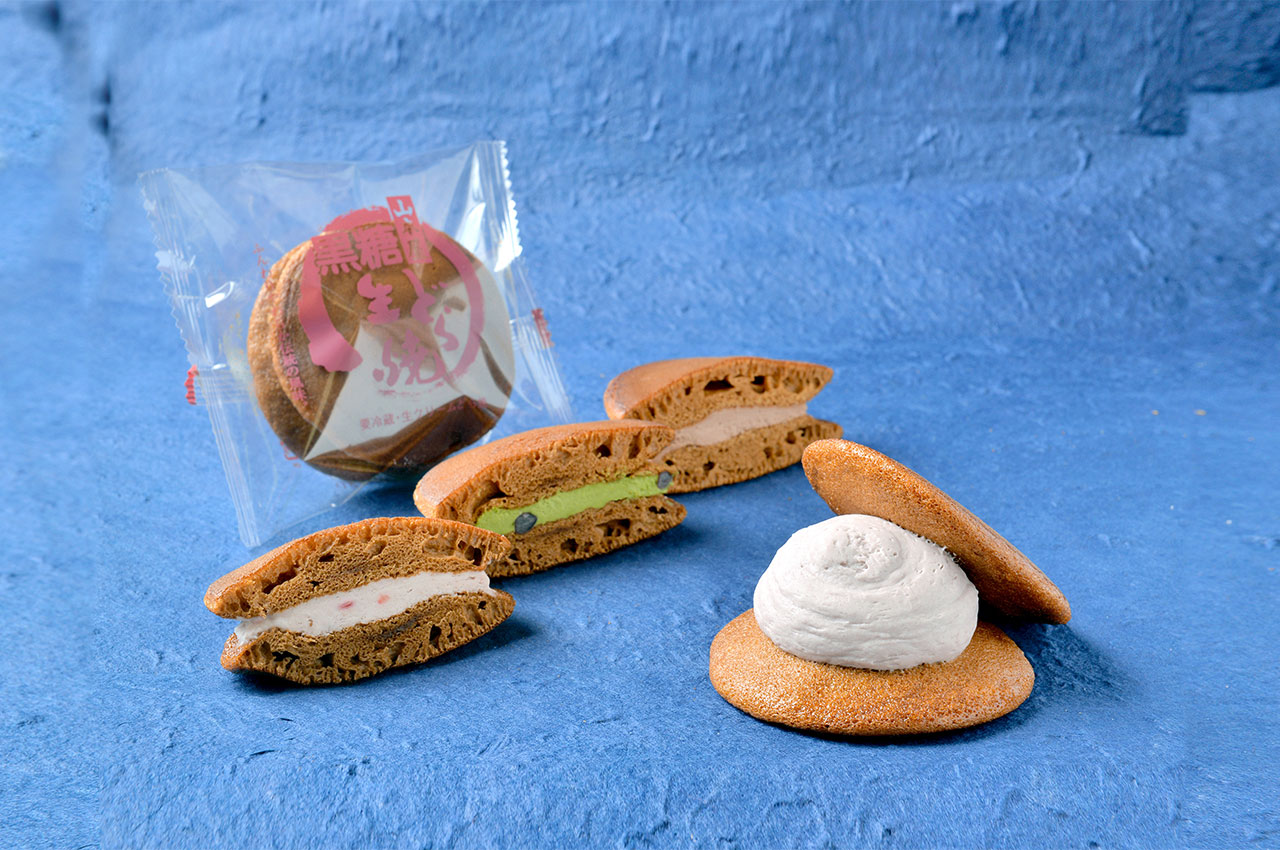 秘伝の製法で作った風味豊かなしっとりモチモチの皮は、波照間島産黒糖と西表島産黒蜜を贅沢に使用しています。十勝産小豆で作る上品なこし餡は生クリームとの相性もバツグン。一口食べたらやみつきです。(小豆・苺・抹茶・チョコほか常時8種類以上/黒糖生どら焼 170円)