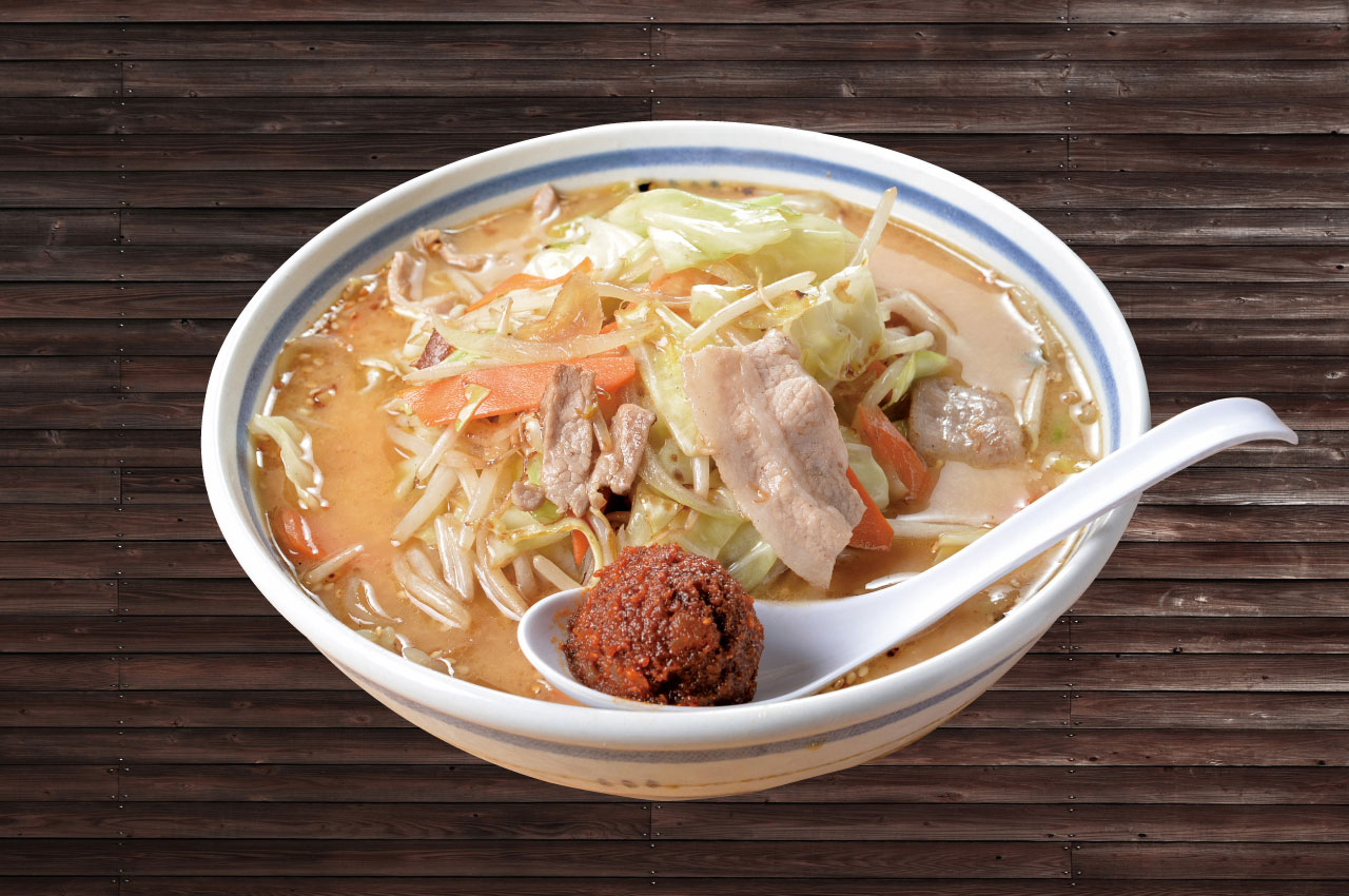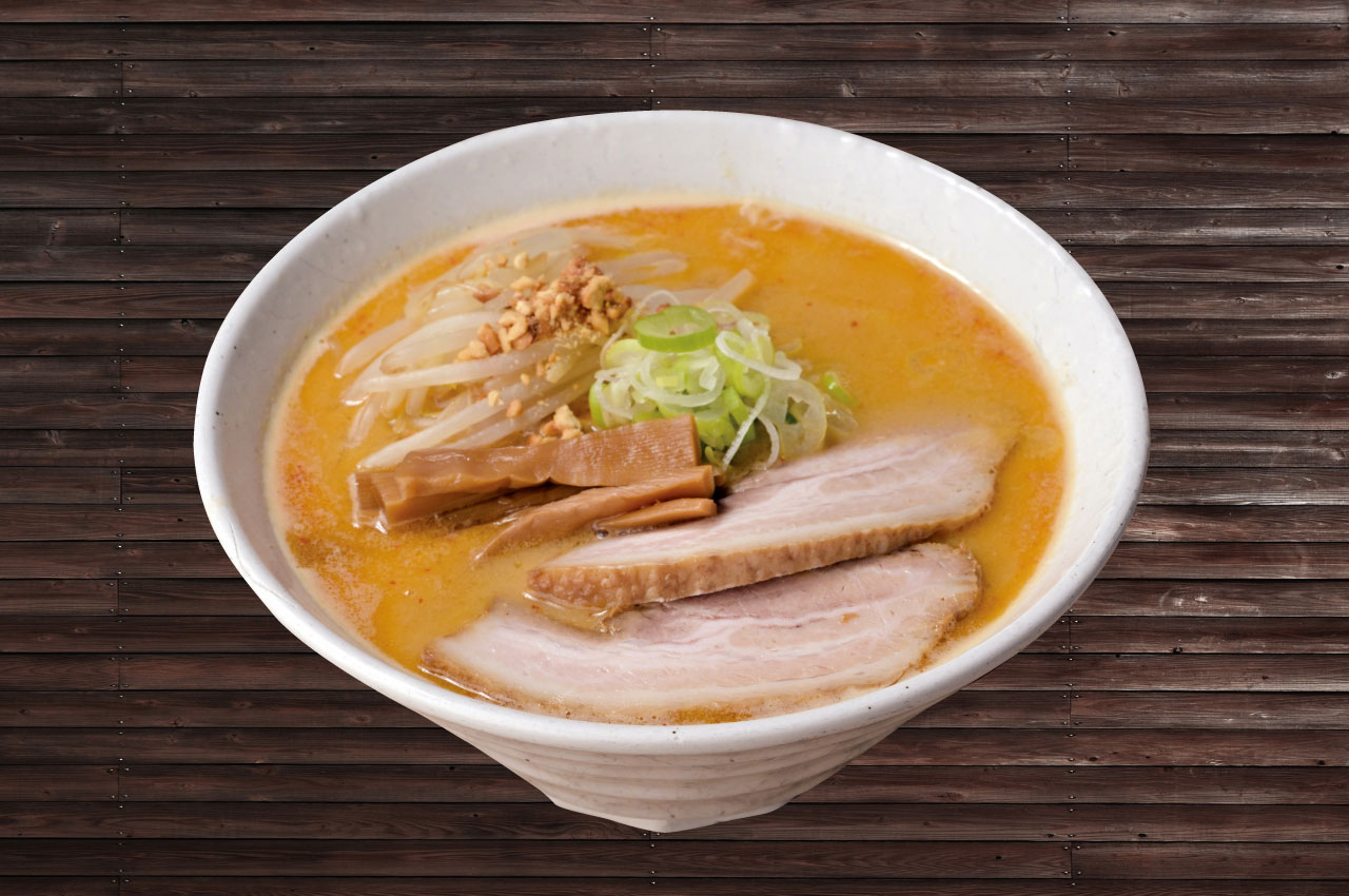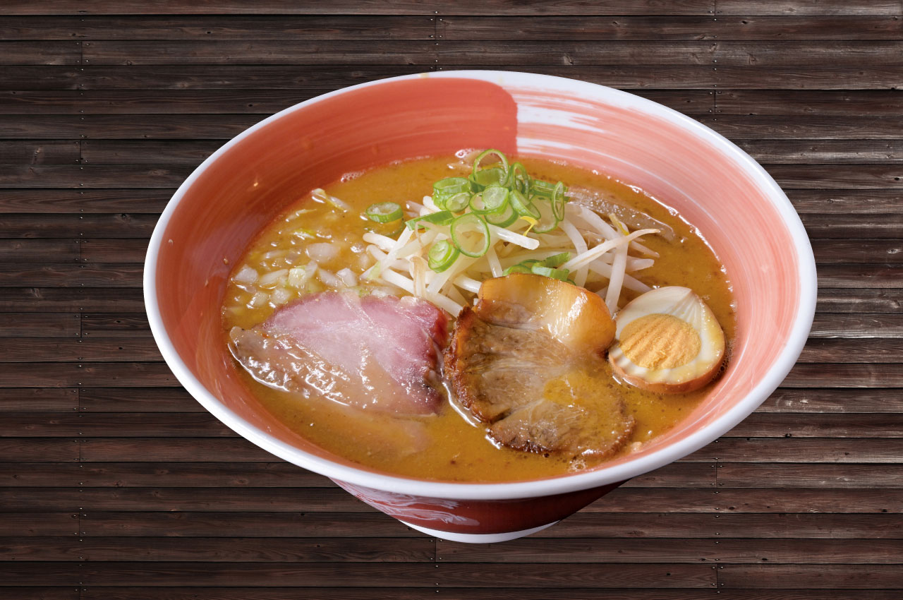毎朝店舗で昆布、香味野菜、豚骨・鶏ガラなどを炊いた出汁に、北海道産の特選赤味噌ダレを合わせた、切れのある濃口スープ。最後まで飽きずに飲み干せる、永年愛される王道味噌ラーメン。