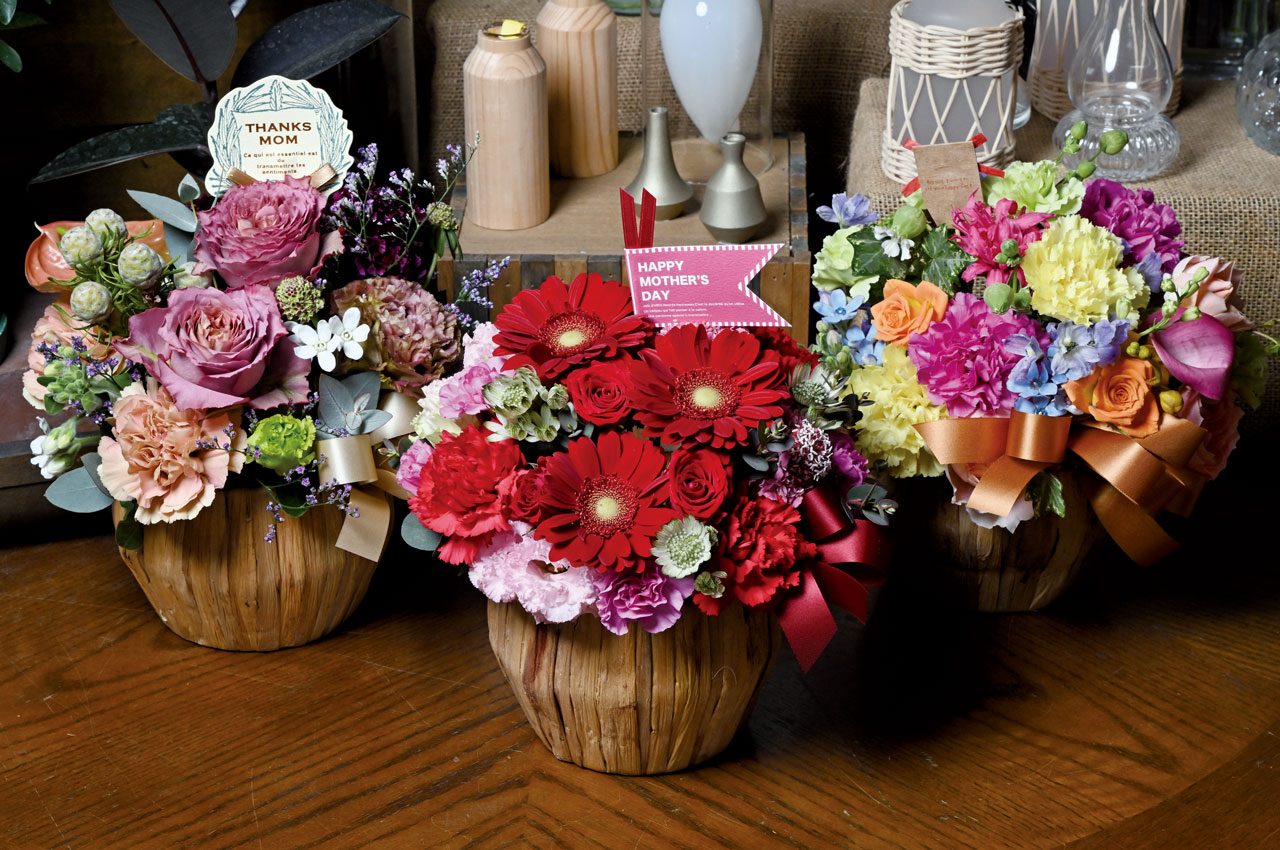 真っ赤なガーベラが情熱的な「キュート」、ファンシーカラーがかわいい「フルーティ」、落ち着いたテイストの「クラシック」。雰囲気の異なる花を、それぞれ美しくまとめたセンスが光るアレンジメント。お母さんの雰囲気にあわせてセレクトしてください。
