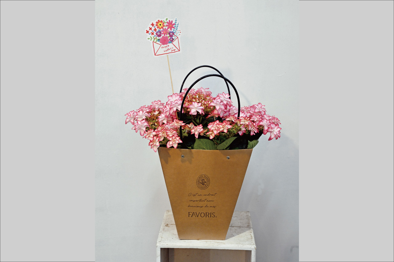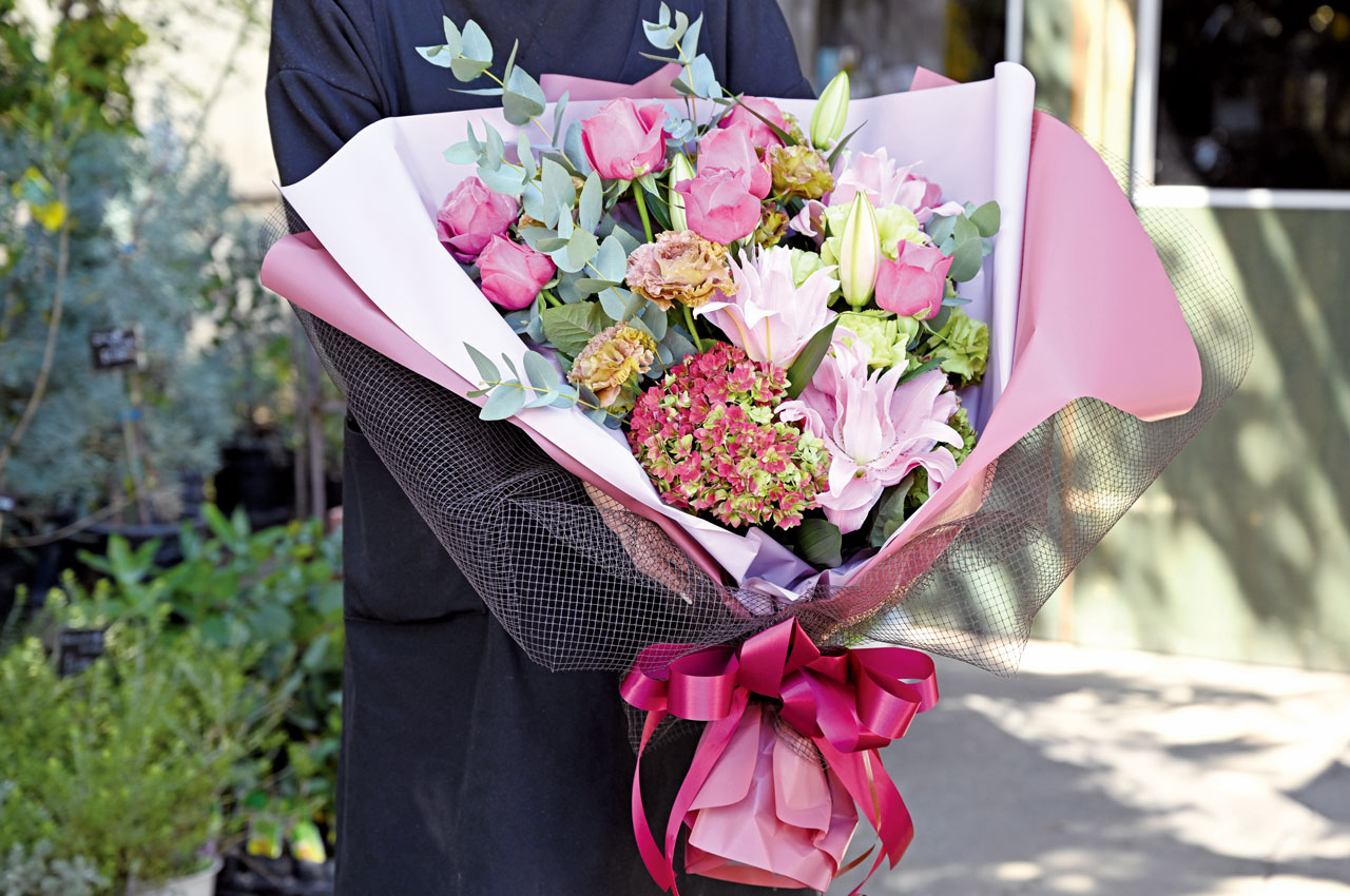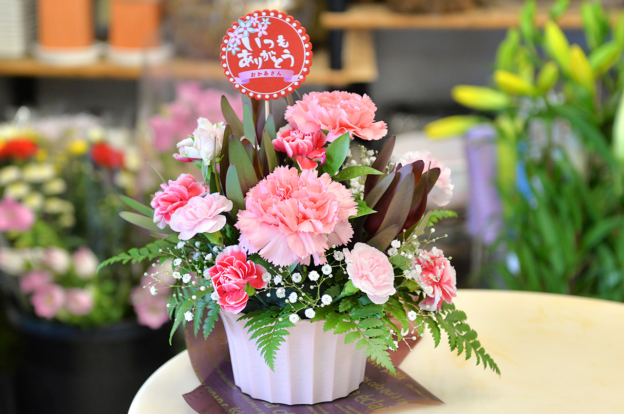 ピンクのグラデーションがきれいな、花瓶いらずの母の日アレンジ。好きな花や色を選んでオーダーもOKです。5月はバリエーション豊かなアレンジがたくさん並んでいるので選ぶ楽しみも。