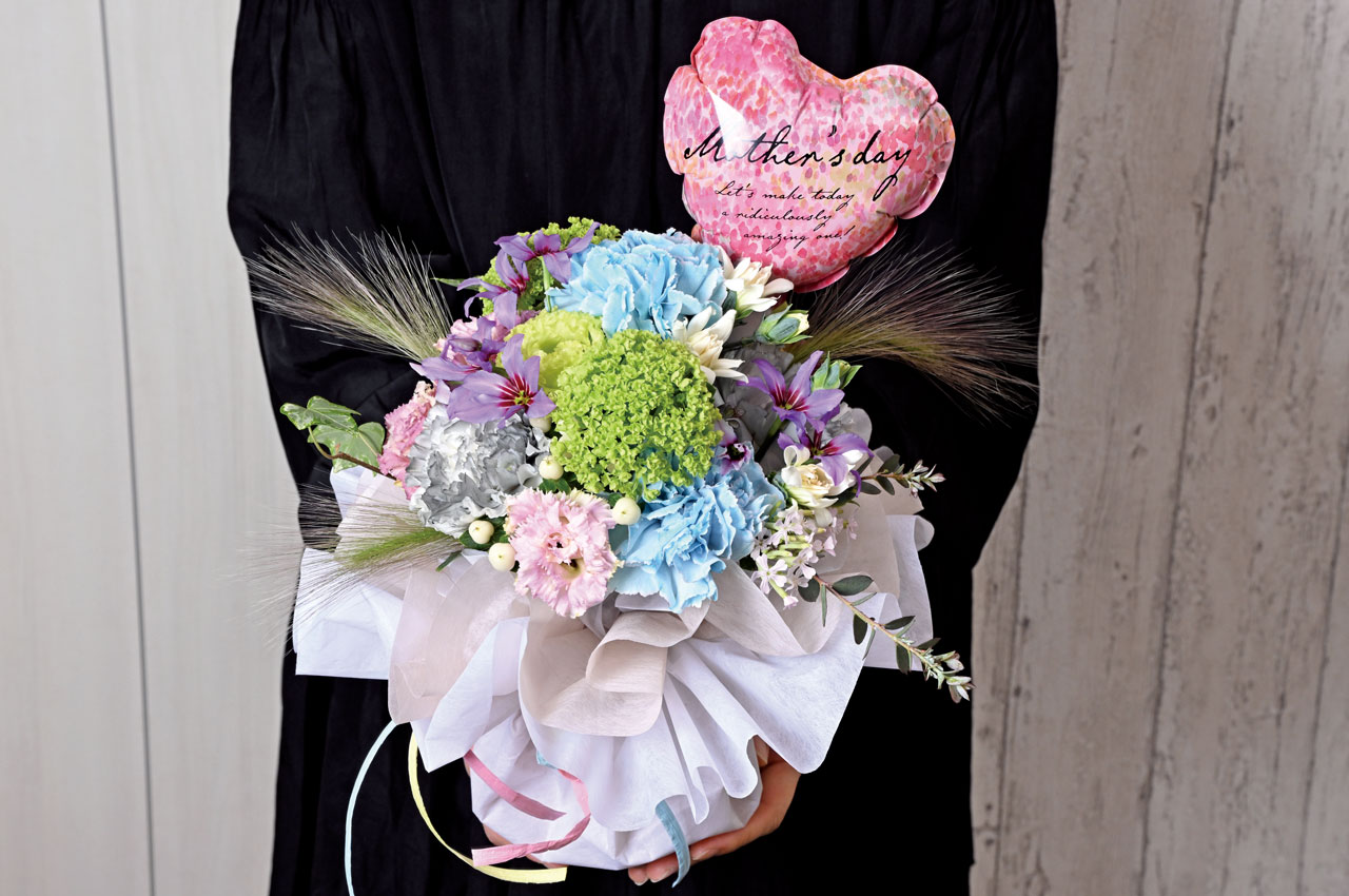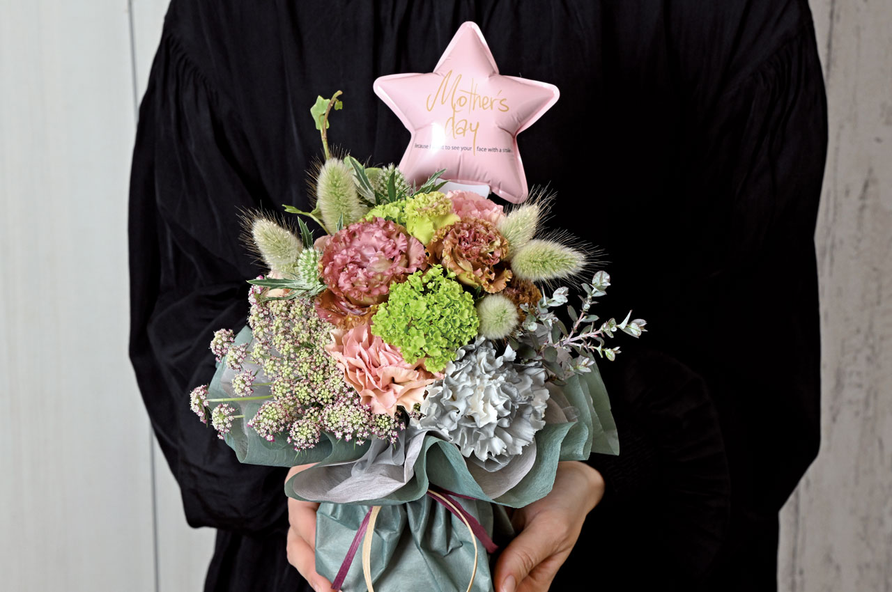 アッシュグレーのカーネーションを主役に、ブーケ風にこんもりと仕上げた母の日ギフト。ドレスのようなラッピングに、バルーンのアクセントで華やかさも倍増。そのまま飾っても、花瓶に移し替えても絵になる一束。
