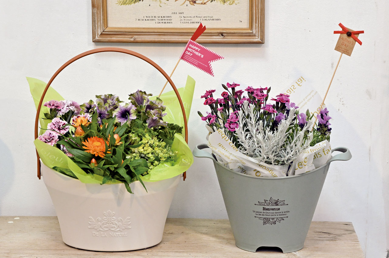 花の美しさを伝え続ける創業50周年の花店。今年の母の日は、ブリキの器に飾られた華やかなカーネーションや寄せ鉢を。2025年5月10・11日、本店ではピアニストによる生演奏も。音楽を聴きながら、ギフト選びをお楽しみください。