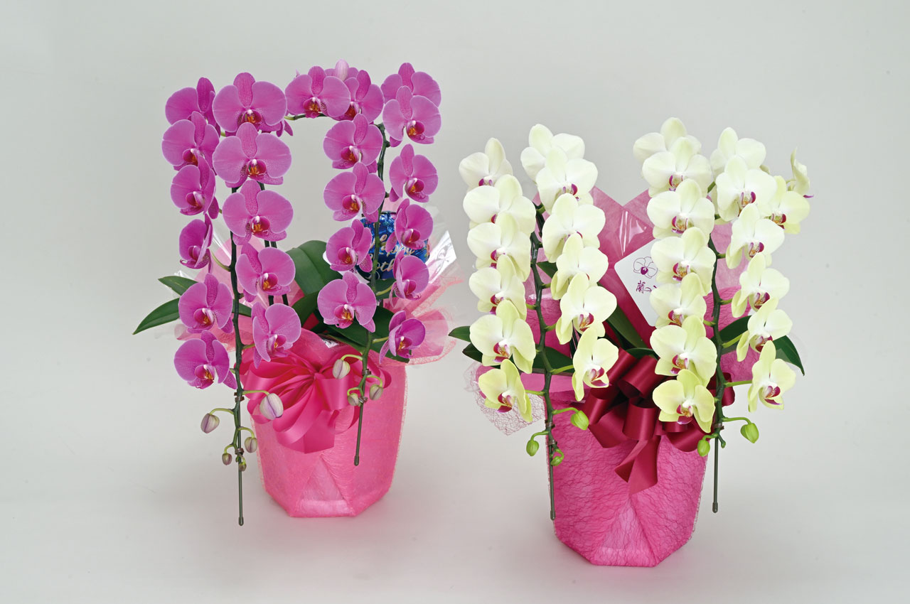 栽培方法にこだわり、より長く楽しめる花持ちの良い胡蝶蘭を栽培&販売。サイズ、色、種類も豊富でどれを選んでよいか迷うほど。お高いイメージの胡蝶蘭ですが、ミニ胡蝶蘭なら2,500円~買えます。水やりは10日~2週間に1度、2本150~200㏄、3本250~350㏄程度が目安。