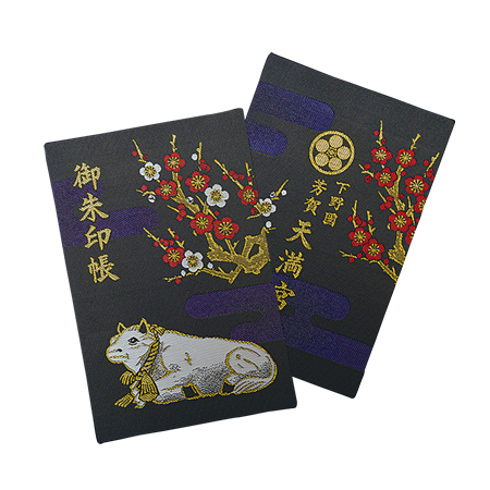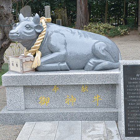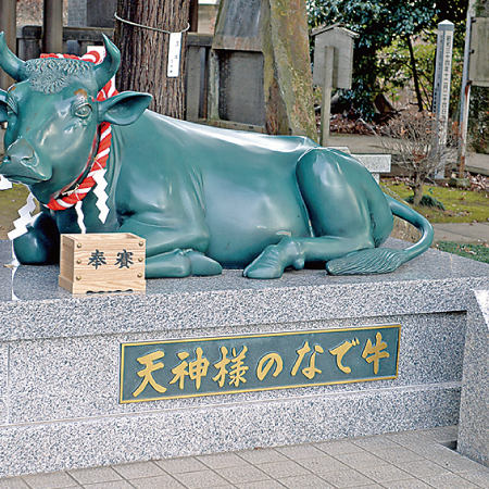 神牛は天神様のトレードマーク。耳もとでお願いを唱えながら、一番気にかかる所を優しくなでると、なでたところとおなじ所にご利益があるそうだ。専用タオルもある。