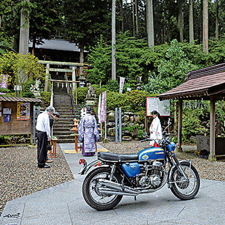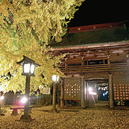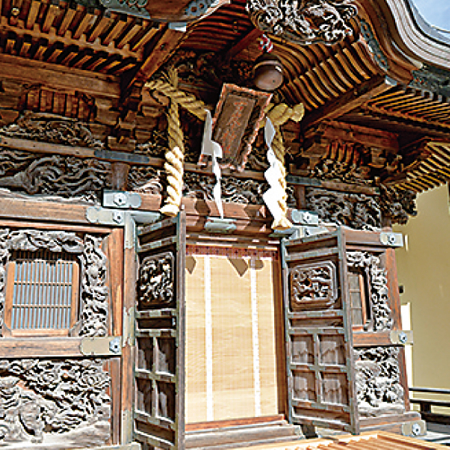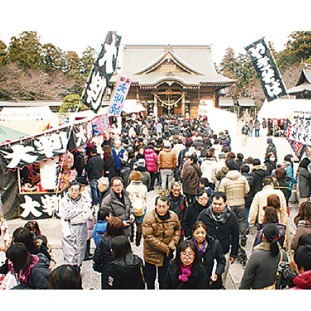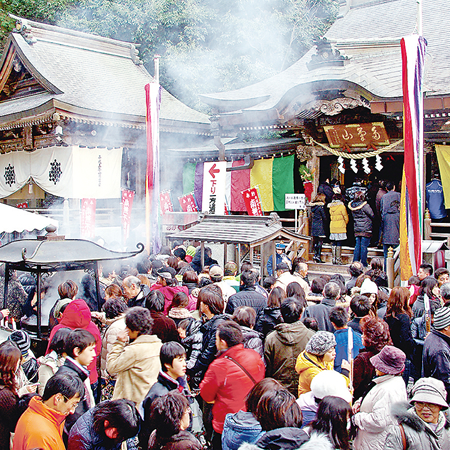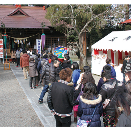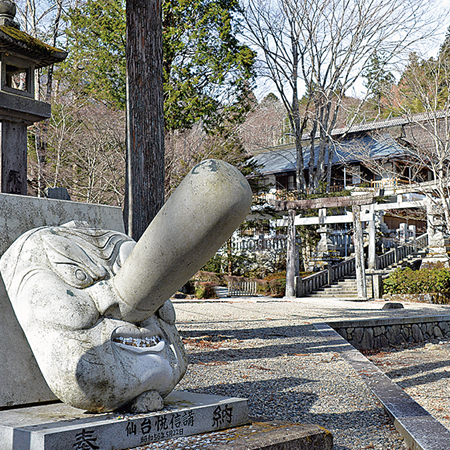 建年月は不詳だが、源義家が滞在したといわれていることから、かなりの古社。自然豊かな大山の中腹にひっそりと鎮座し、厄除・病気平癒・心願成就の社として県内外から多くの参拝者が訪れる。苔むした石段や、木漏れ日に照らされた境内は趣があり、遊歩道が山頂まで伸びているので、初詣ついでにゆっくり散策してみよう。朱塗りの御本殿は江戸時代に建立されたもの。毎年奉納されるチェンソーカービングで彫られた干支は、山本和孝さん作で子から戌まで11体あり、一対の龍の“狛犬”も目を引く。