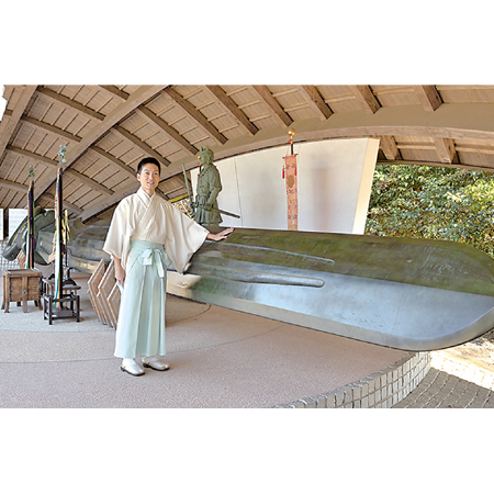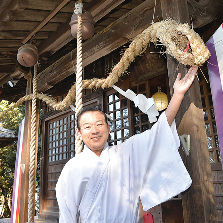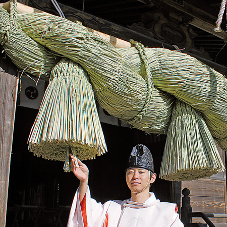 目を引く「縁結び子宝の大注連縄」は、出雲大社と同じ作りで重さ300㎏、長さ4m、最大周囲1.7m。編まれている大きい二本の縄は両親を表し、房は3人の子どもを表している。つまり、5人家族を表現。子どもが1人では人口が減り、2人で現状維持、3人以上の子どもがいないと家の繁栄、社会の繁栄、国の繁栄はないといましめている。