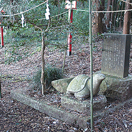 参道中腹に鎮座している神亀の石。体の悪い部分を撫でるとよくなると言われている。