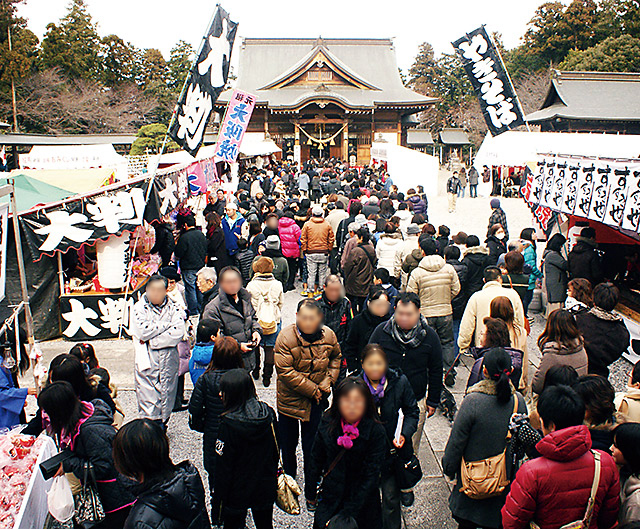 783年に疫病退散を願い建立されたと伝えらえれ、2013年にご鎮座1,230年を迎えた歴史ある神社です。御祭神はヤマトタケルノミコトで、厄除け・方位除け・交通安全・家内安全のご利益があるとされています。新春1月3日までは、多くの出店や屋台が境内ににぎわいを添えます。