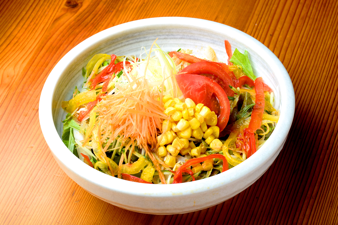 レタス、きゅうり、にんじん、パプリカ、トマトなど色鮮やかな野菜の下には、緑藻類の一種でビタミンやミネラル、タンパク質が豊富な栄養食品・クロレラを練りこんだ緑色の麺が。健康にこだわった「サラダらーめん」(972円)です。香り高いゆず胡椒ドレッシングを絡ませていただきましょう。