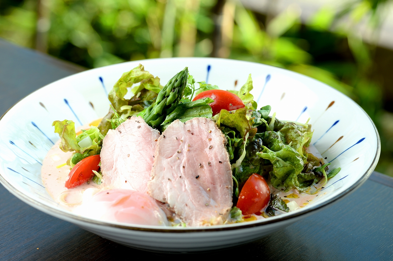 ポモドーロとはイタリア語でトマトの意味。そしてトマトは昔から黄金の林檎と呼ばれているそう。「冷やし! 黄金の林檎ポモドーロ」(1,200円税別)は、パスタと見まがうイタリアンな一品。トマトとチーズで作るソースに、モチモチの自家製麺。そこにレタスなどの野菜をたっぷり。温玉がいい感じのうま味ととろみを出しています。