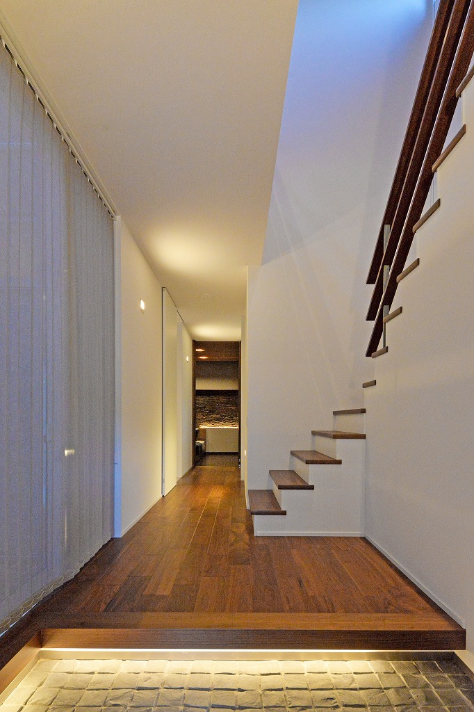 真っ白な廊下が奥まで続く、シンプルなつくり。足元を照らす間接照明付き。