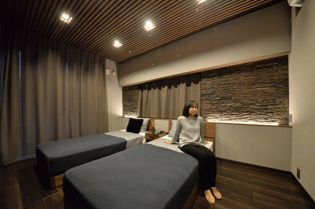 天然の木材と石材、明るすぎない照明が調和する、やすらぎの空間です。