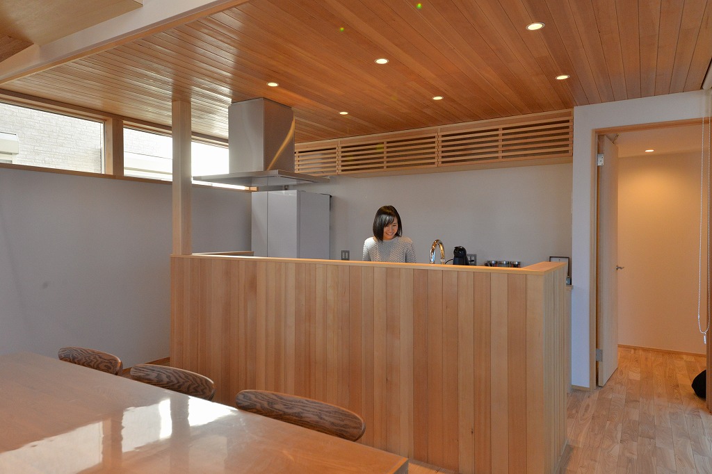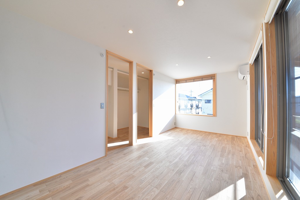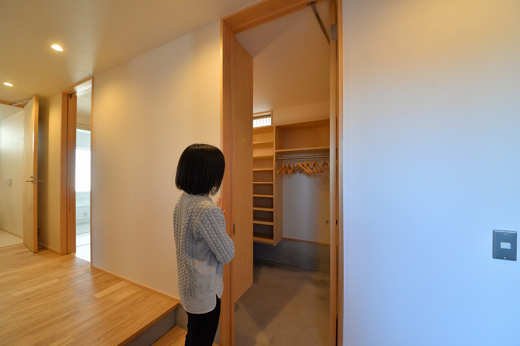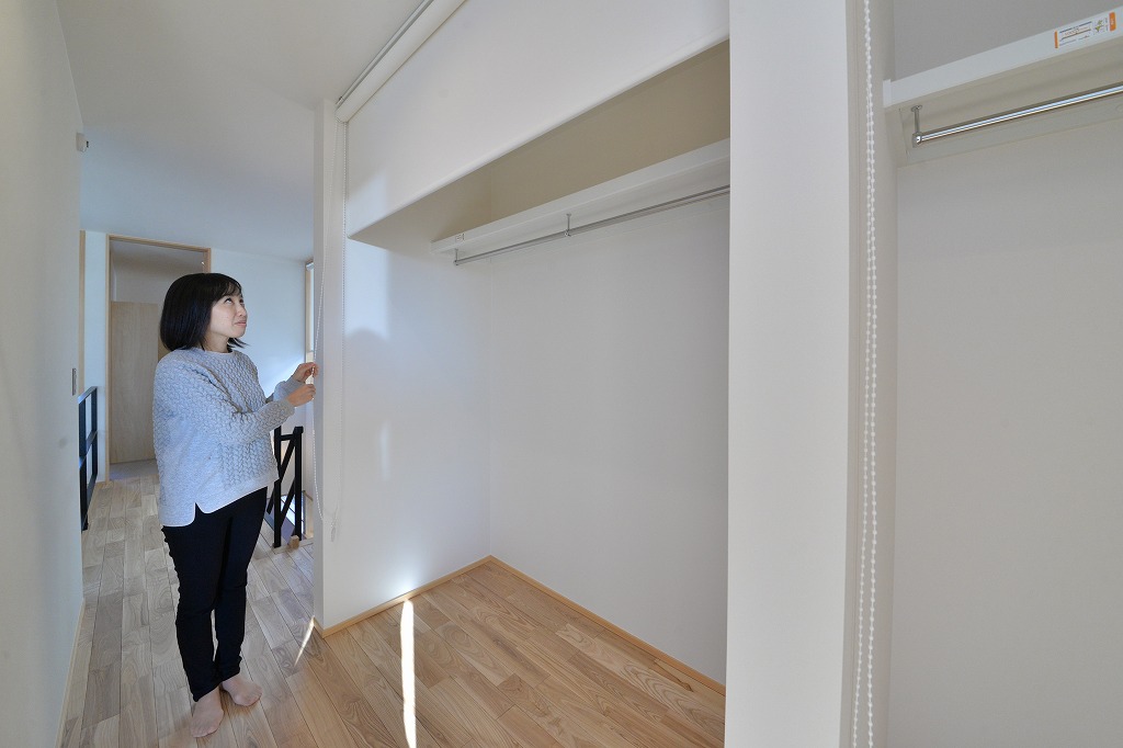 熟練の技術をもつ大工さんによるていねいな仕事で仕上げられた、木材をふんだんに使った、あたたかみのある株式会社川中子住建のオーダーメイド住宅。吹き抜けのある家は、家中に家族の声が届き、少し顔を出せば互いに目を合わせることができます。部屋を広く使うための工夫として、部屋と収納スペースが分けられているところにも注目してみてください♪