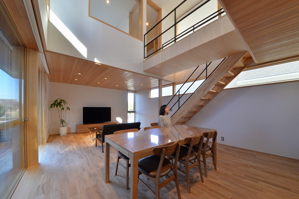 吹き抜けと大きな窓のおかげで、明るく開放感のある空間。家族団欒にぴったりです。