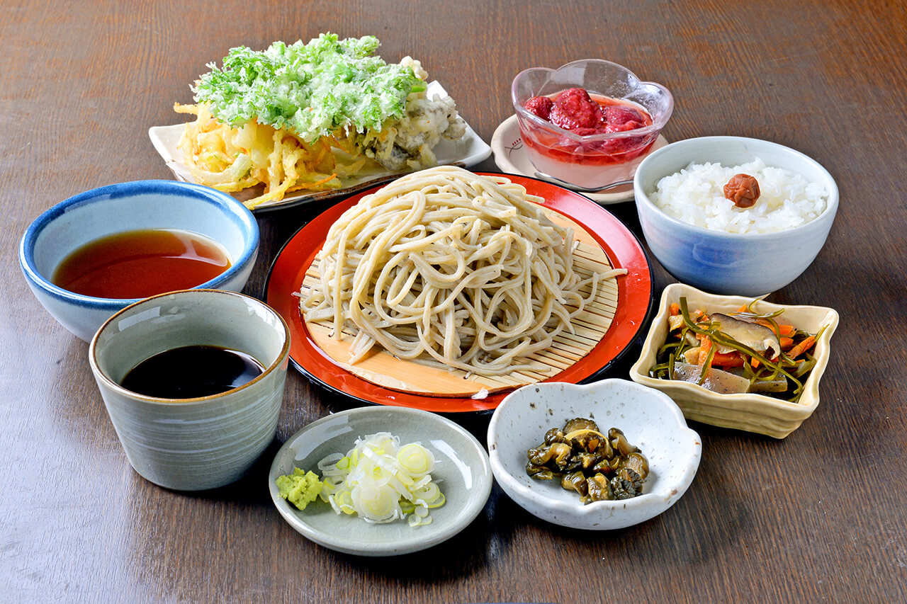 郷土料理「ちたけそば」に天ぷらと田舎料理の小鉢付き。