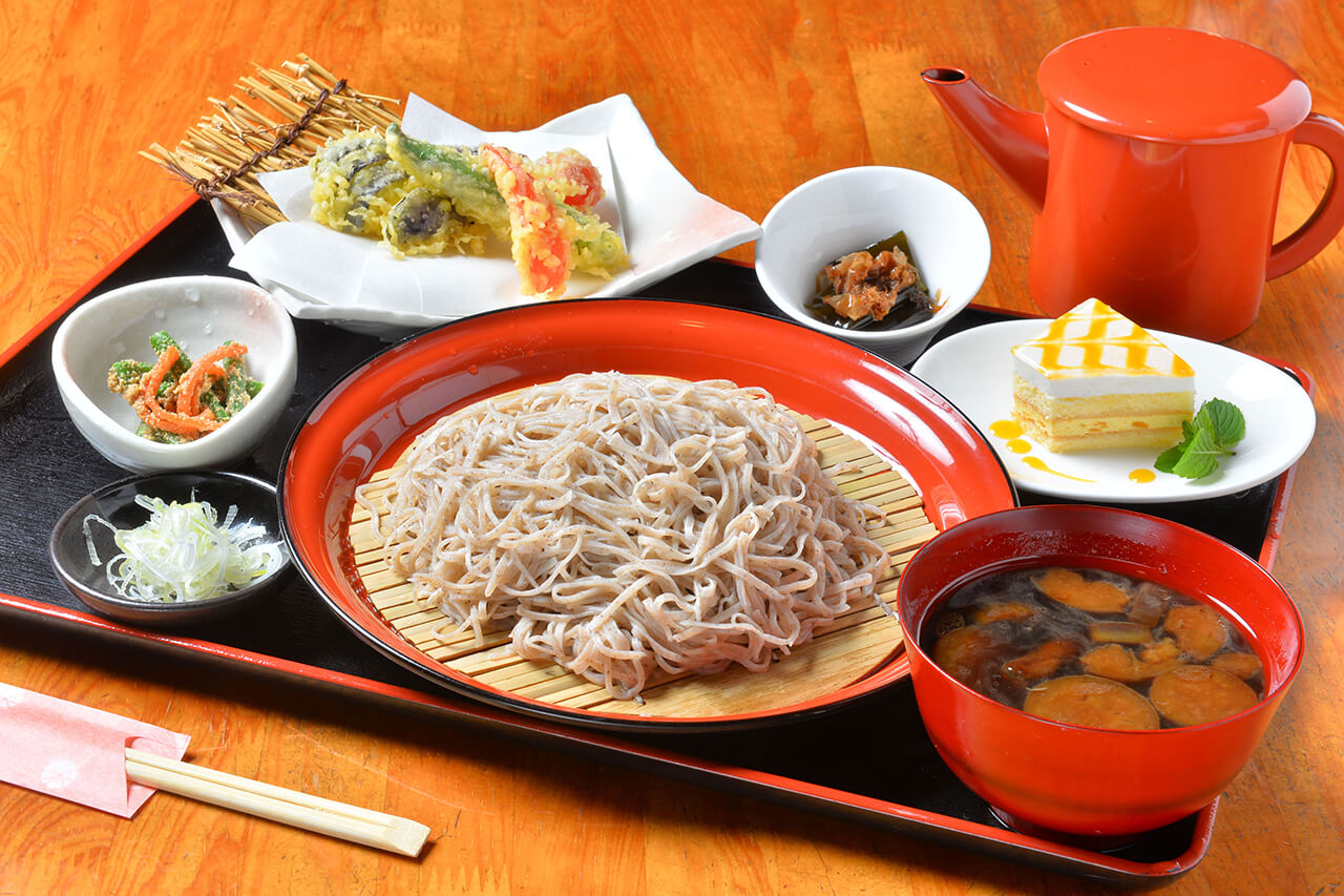 地元と栃木県産のそば粉を独自にブレンドし、そば職人が毎日目の前で手打ち。打ちたて茹でたてのコシと、香り高いおいしいそばを味わいましょう。そばゼリーの上には、カリカリのそばの実がトッピングされ、つるんとしたゼリーとともにそば本来の風味も堪能できます。