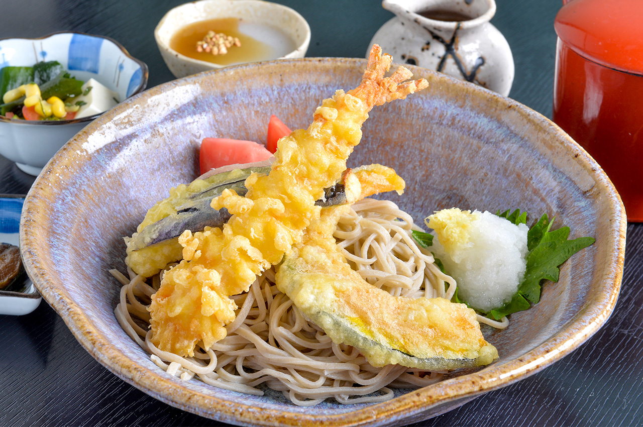 茹でたてそばとサクッとあがった季節野菜の天ぷらが香る。