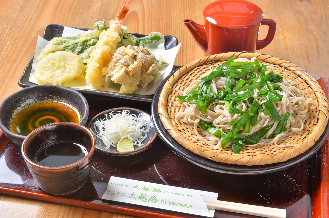 粟野と永野をつなぐ大越路峠に店を構える名店。初代の味を守り続けているそば打ちは現在3代目。毎朝石臼で粗く挽いた地粉を使う三七そばは、香りが深くコシの強い薄平切りそば。2020年8月に夏季限定の鹿沼夏そば「碧い瞳」が初登場。味よし色よし香りよしで、従来の夏そばの概念を変える逸品です。