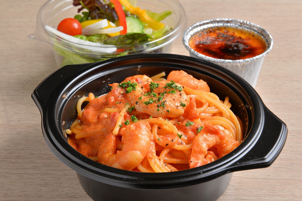 ランチBox「小エビのトマトクリームスパゲティ」(パスタ・サラダ・カタラーナ) 1,080円 ※単品は900円です。