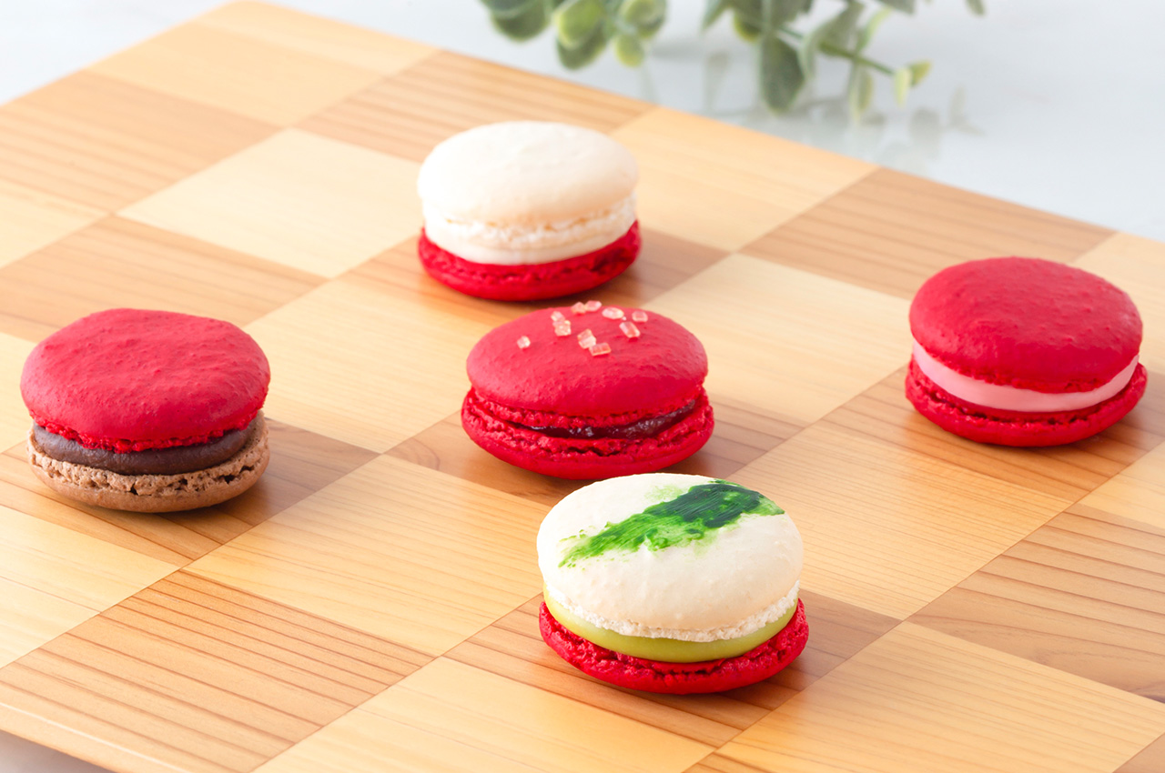 栃木を代表するいちご、「とちおとめ」と「とちあいか」。それぞれの特徴を生かし、バニラ、ショコラ、ピスタチオなどと組み合わせた5種類のマカロンが楽しめる人気のセット。フォーマルな場にも適した上品なルックスです。