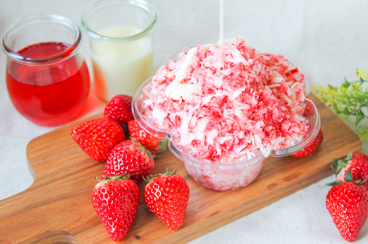 お出かけ先でのおもてなしには、栃木県産完熟いちご100%のかき氷。いちごを技ありで凍らせ、シャリシャリに削った「いちご」に、上から練乳をた~っぷりと。口の中でス~っと溶け、いちごの甘味と酸味がダイレクトに味わえます。ビタミンCもたっぷり! 暑さで疲れた体に染みわたります。夏のいちごは凍らせて味わうのが吉!