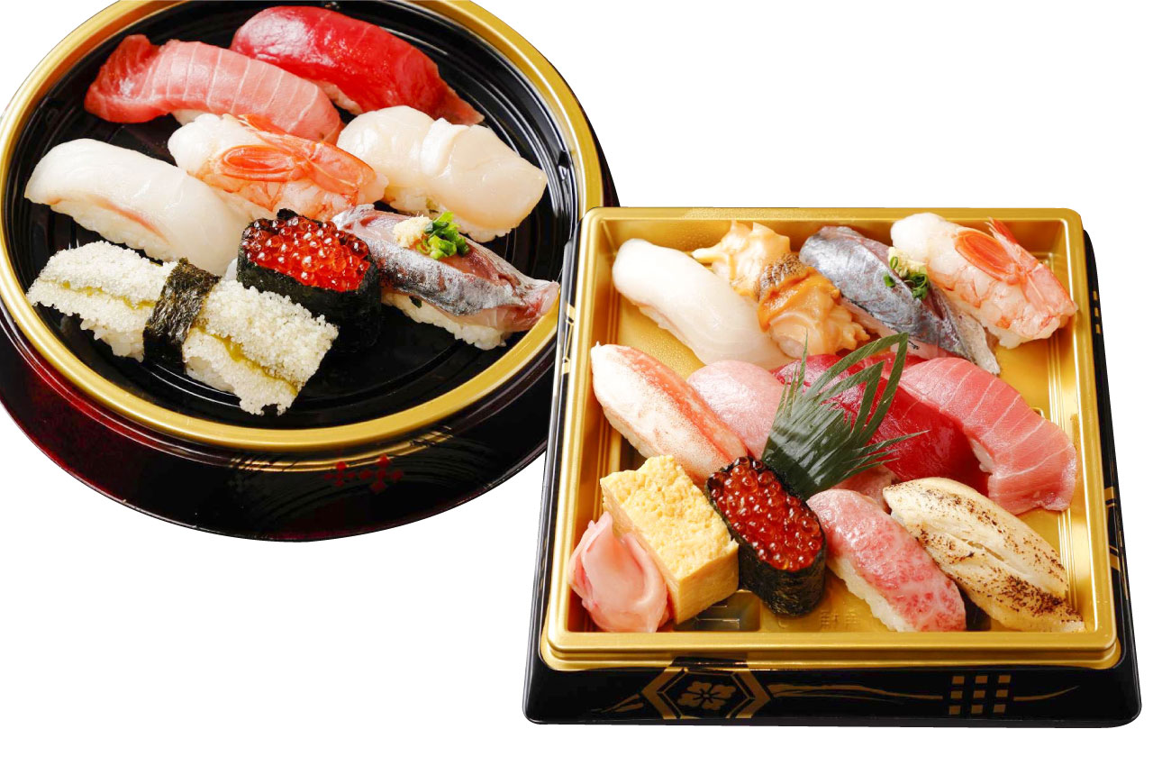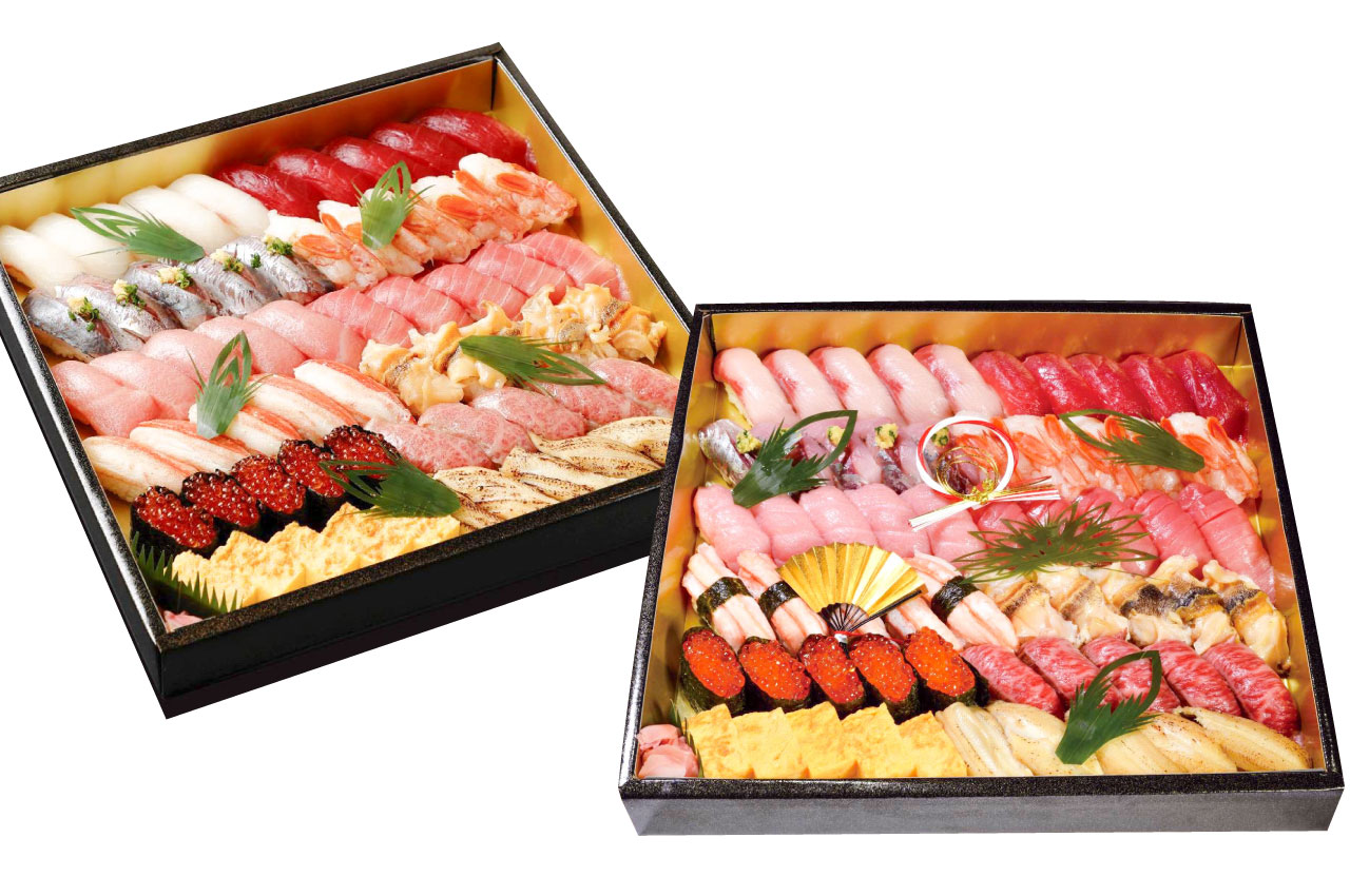 厳選された新鮮な食材を使い、熟練の技で一つひとつていねいに握られた寿司は、2人でゆっくり、みんなでワイワイ、さまざまなシチュエーションの食事にぴったりです。お寿司で楽しむクリスマスパーティーはいかがですか? 家族や親せきが集まる年末年始のお食事にもぴったりです。(写真左)特撰華盛5人前/60貫13,500円、(写真右)正月飾り華盛5人前/60貫13,500円。予約がおすすめです。