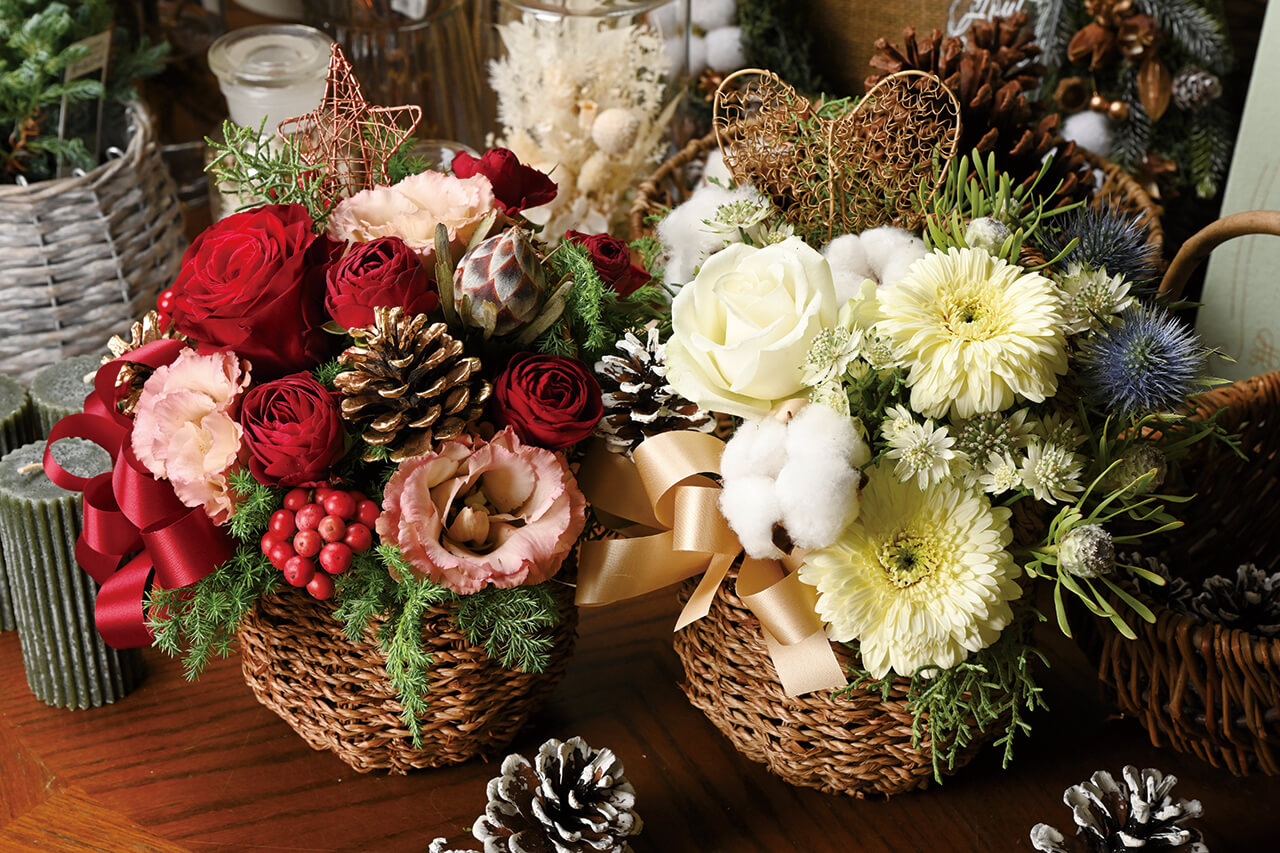真っ赤&真っ白な県産のバラが光るクリスマスアレンジ。「花と一緒に素敵な時間を過ごしてほしい」と季節の花々やワイルドフラワー、オーナメントを束ね、とっておき感を表現。そっと飾っておくだけで空間がパッと華やかに。