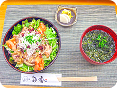 壬生産の有機野菜と、これも壬生産の和豚もちぶたを塩ダレで炒めご飯にのせた、壬生の魅力たっぷりの壬力丼。