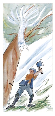 狐の後を追ってきた勝善卿(しょうぜんのかみ)という人が、退治のために、大木を斧で切り始めます。しかし、不思議なことに、オガクズは翌日になると幹に戻ってしまいます。